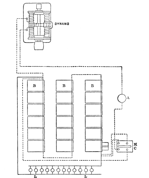 A small installation at Kensington Court, erected two years ago, for the purpose of supplying the houses in the immediate neighbourhood, has rapidly developed, and underground mains have been led in many directions from the station, and a constant service of electricity is provided for by means of secondary batteries. As this is the first practical exposition of the secondary batteries’ system of distribution, it is proposed to describe the installation under that head. Central-stations are also at work in Liverpool, Leamington, Taunton, Exeter, and there are also five large installations nearly completed in London, besides the Kensington Court station, all of which will probably be in full swing before the end of the year.