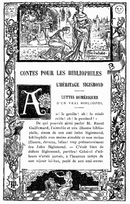 The Project Gutenberg EBook of Contes pour les bibliophiles, by Octave Uzanne This eBook is for the use of anyone anywhere in the United States and most other parts of the world at no cost and with almost no restrictions whatsoever. You may copy it, give it away or re-use it under the terms of the Project Gutenberg License included with this eBook or online at www.gutenberg.org. If you are not located in the United States, you'll have to check the laws of the country where you are located before using this ebook. Title: Contes pour les bibliophiles Author: Octave Uzanne Illustrator: Albert Robida Release Date: January 25, 2020 [EBook #61239] Language: French Character set encoding: ISO-8859-1 *** START OF THIS PROJECT GUTENBERG EBOOK CONTES POUR LES BIBLIOPHILES *** Produced by Laurent Vogel and the Online Distributed Proofreading Team at http://www.pgdp.net (This book was produced from images generously made available by the Google Books project and the Bibliothèque nationale de France (BnF/Gallica) at http://gallica.bnf.fr)