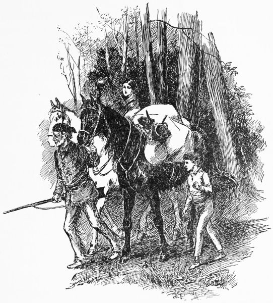 The cool days of No-vem-ber had come ere wife and chil-dren, with two hor-ses which a friend had loaned, and what goods were left, set out for the far off land of In-di-an-a. When night came they slept on the ground on beds made of leaves and pine twigs. They ate the game the ri-fles brought down, cooking it by the camp fire. From time to time they had to ford or swim streams. They were glad that no rain fell in all their long route.