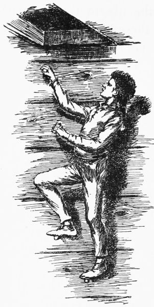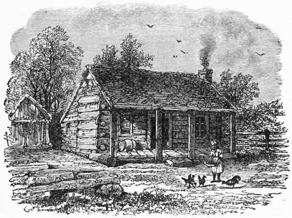 Their beds were still heaps of dry leaves. The lad slept in a small loft at one end of the cab-in to which he went up by means of pegs in the wall. A-bra-ham was then in his eighth year, tall for his age, and clad in a home-spun garb or part skins of beasts. The cap was made of the skin of a coon with the tail on. The child[17] did much work. He knew the use of the axe, the wedge, and the maul, and with these he found out how to split rails from logs drawn out of the woods. To clear the land so that they could plant corn to feed the fam-i-ly, and hew tim-ber to build the new house was work that gave fa-ther and son much to do. At last Sa-rah and A-bra-ham felt that they had a house to be proud of, though it was not much bet-ter than the one they had left. Its floor had not been laid, and there were no boards of which to make the door when they moved in. Some friends had come to see them, and as there would be more room for them in the new house they went to live there. It was a glad day when Thom-as Spar-row, whose wife was Mr. Lin-coln’s sis-ter, and Den-nis Hanks, her nephew, came.