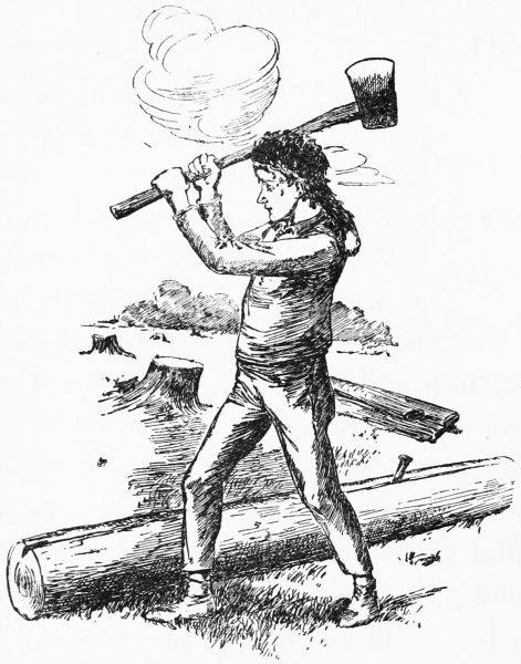 When Spring had gone by, and the warm days of 1830 had come, A-bra-ham Lin-coln left home and set[29] off to get a job in that new land. He saw new farms with no fen-ces. He was sure that his axe could cut up logs and fell trees. He was in need of clothes. So he split 400 rails for each yard of “blue jeans” to make him a pair of trou-sers. The name of “rail-split-ter,” came to him. He knew that he could do this work well. All he met would at once like him. It was the same way in the new state as it had been in the last.