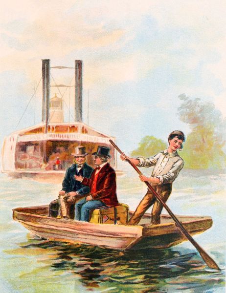 The first mon-ey that he thought he might call his own he earned with a boat he had made. It seems that one day as he stood look-ing at it and think-ing if he could do an-y thing to im-prove it, two men drove down to the shore with trunks. They took a glance at some boats they found there, chose Lin-coln’s boat, and asked him if he would take men and trunks out to the steam-er. He said he would. So he got the trunks on the flat-boat, the men sat down on them, and he sculled out to the steam-er.