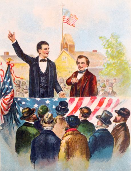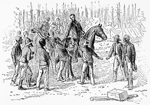 When first in New Or-leans, though Lin-coln had seen slaves, he had not known what a slave sale was like. This time he saw one and it made him sick.[31] Tears stood in his eyes. He turned from it and said to those with him, “Come a-way, boys! If I ev-er get a chance, some day, to hit that thing,” (here he flung his long arms to-ward that block), “I’ll hit it hard!”