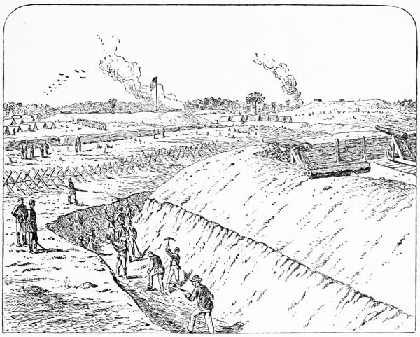 When ten days had gone by a quick march to the left was made by Grant’s ar-my and they all got a-cross the James Riv-er. They tried to take Pe-ters-burg so that they could cut off one source of the stores sent to the foe, but they found the works too strong to be seized by storm. Then the Un-ion troops built trench-es close up to the foe’s works and staid there nine months.