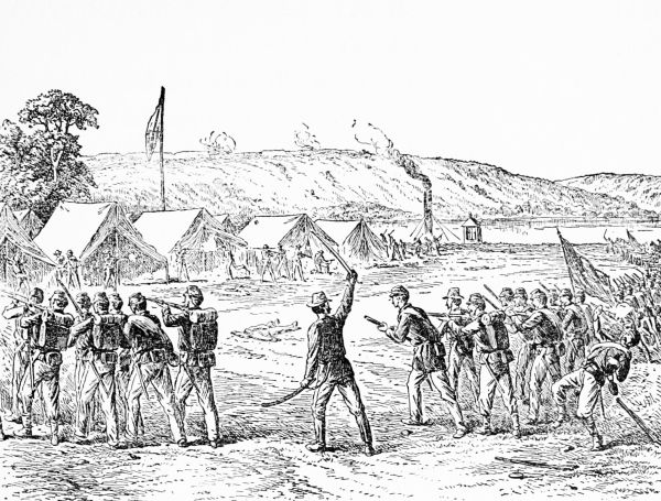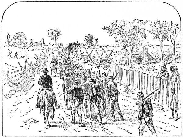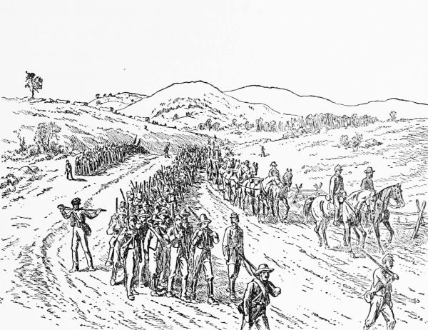 The day drew near its close. The shad-ow of Look-out Moun-tain fell far a-cross the plain. The last rays of the sun, ere it sank from sight, shone bright on the arms of the troops as on they came.