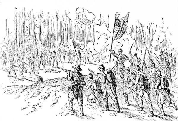 Then the Ar-my of the Po-to-mac un-der Grant and Meade made a move to-ward Rich-mond. It met Lee in dense woods known as “The Wil-der-ness,” and there, and in and a-bout Spott-syl-va-ni-a Court House, fought for 16 days. The Un-ion ar-my lost 37,000 men. Lee, who led the foe, lost vast hordes, still he would not give up. Grant saw that he must get near-er to Rich-mond and this he did in a qui-et way by send-ing off a part of his ar-my from his right and march-ing it a-round to the rear of his oth-er troops. Then he pushed it as far a-head as he could on his left. Though “out-flanked,” Lee would fall back in time to be a-gain twixt Grant’s troops and Rich-mond. With troops so well matched it was hard for ei-ther to win.