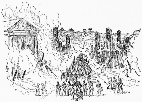 In the ear-ly morn of the day on which the foe’s troops had marched out of Rich-mond, the or-der was giv-en to burn the bridge o-ver which they passed. At the same time, flames burst from win-dows and roofs of tall build-ings, and in a few hours 800 of them were on fire.