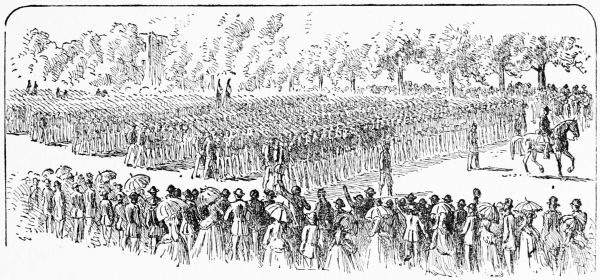 But when the Un-ion troops were on their way North, a few weeks lat-er, May 23, 1865, and 65,000 of[138] them in full strength and health marched in di-vis-ions, in close lines, round the cap-i-tol at Wash-ing-ton, A-bra-ham Lin-coln, the “well be-loved,” was not there to see them. His work was done. He had gone to his Re-ward.