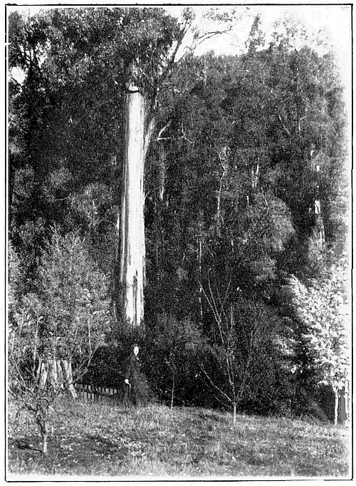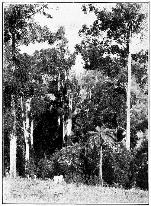 The huge gum trees are, as a rule, the main feature in the forest landscape, but this is varied by curiosities like the grass tree and the bottle tree; while in the moister regions, as in the forests of Gippsland, we find 33 beautiful tree ferns of every kind. Here are specimens of grass trees and gums. Everywhere we 34 find the acacia and the wattle with its sweet scent, the banksia shooting up into great trees, and the 35 beautiful waratah; everywhere, too, where the rainfall is sufficient, flowers of the same order as those with which we are familiar in Europe grow in great profusion.