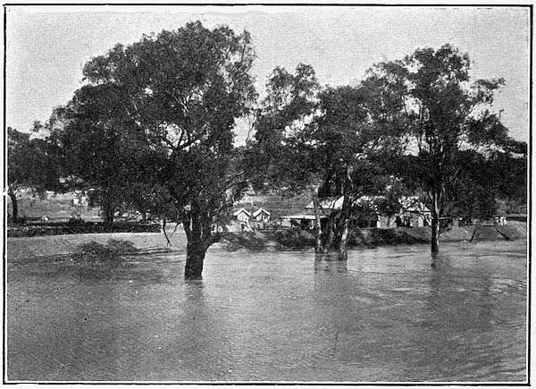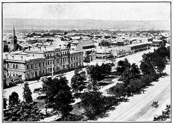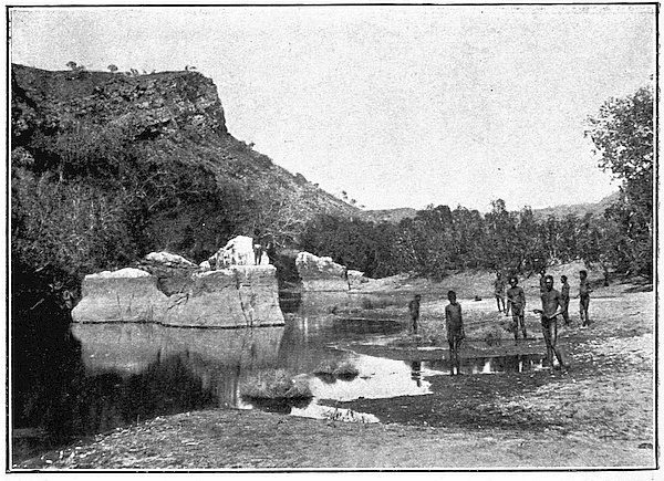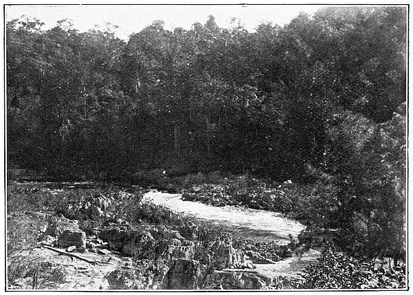 Now let us turn for a moment from the animal to the plant life of Australia. In the tropical parts of Queensland there are many plants which belong to the Malayan region as a whole; this we might expect. We may see palms growing even at Brisbane; while 23 further north they form a dense forest, thoroughly tropical in appearance, with its creepers and undergrowth, as we see in these two pictures. But further 24 south we meet more species peculiar to Australia, in the vegetable no less than in the animal world. 25 The typical Australian plants are those specially adapted to resist hot sunshine with drought, and often sudden changes of temperature. All over the continent the gum trees give a special mark to the landscape 26 of the forest. The leaves hang vertically, so as not to give a large exposure of surface to the hot sun, and are collected in dense clusters for the same purpose of protection; so that we miss much of the spreading shade of our English trees. The leaves, too, are alike on both sides, and the colour is more uniform than in our own trees, nor do they change colour and fall in autumn, but decay gradually on the stalk. The bark of many of the gums hangs in strips, thus spoiling the appearance of the huge trunk, for huge it is, rising to four hundred feet in some species. Owing to the character of the foliage the forests are more open than our own, except in the wetter parts where there is a dense undergrowth of fern and creeper. These districts are always near[11] the coast. As we travel away from the coast the forest thins out, except along the watercourses, and becomes 27 smaller and more stunted. In place of trees with leaves we find thorny scrub of various kinds, such as the 28 mulga, whose leaves are replaced by woody spikes still more resistant to drought. Finally we reach the salt-bush 29 and spinifex and wiry grasses of the desert interior. Often there is little but bare rock as in the 30 pictures before us. The watercourses themselves may dry up in the hot season, leaving a desolate expanse 31 of sand and stones, but the line of trees still marks the presence of moisture below. 32