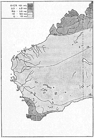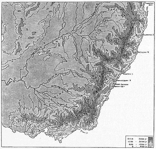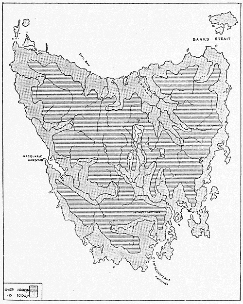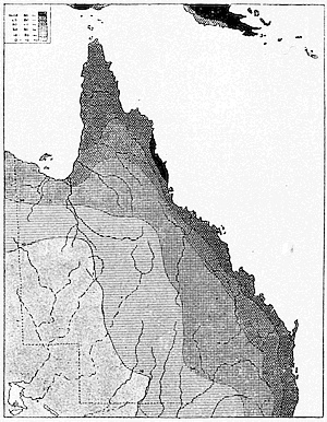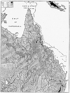 We may now be able to understand why this country of strange plants and animals had no attraction for the Dutch trader, especially in the drier west; in fact, it could have no trade until it had been settled by Europeans bringing with them European crops and animals. In India and Malaya there was already a[12] basis for trade in some of the natural products of the region; while the natives were sufficiently advanced in civilisation to make commercial intercourse possible. It was far otherwise in Australia. The aborigines, as we found them, were as primitive as the plants and animals. They are not black, but a dark-brown people, and their hair is waved and silky, not curly like that of the negro. They are different also from the negro in the shape and build of the head and face. There are various theories as to their origin, but the nearest correspondence seems to be in some of the ancient hill tribes of India and the Veddas of Ceylon. At any rate they are quite different from the Malays, and equally also from the now extinct Tasmanians. The Tasmanians had woolly hair, and perhaps represented the remnants of an earlier and even less developed race than the invaders from the north.