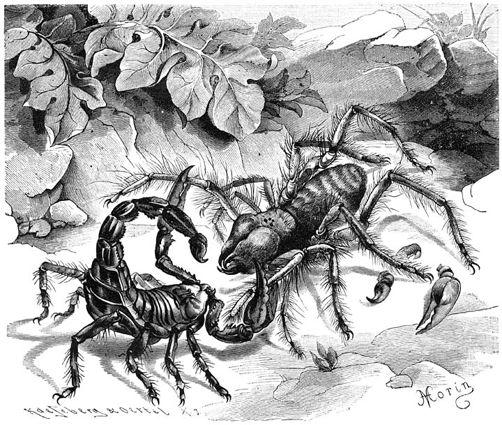 Strijd tusschen een Gewone Rolspin (Galeodes araneoides) en een Schorpioen. Ware grootte.