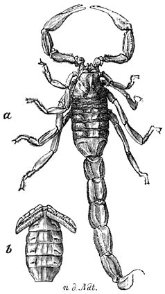 Veldschorpioen (Buthus occitanus):—a) Rugzijde.—b) Buikzijde van het vóórachterlijf: aan het 1e segment komt de geslachtsopening voor, aan het 2e zijn de kammen gehecht; de ademgaten bevinden zich aan het 3e–6e segment, die 4 paar longen bevatten.—Ware grootte.