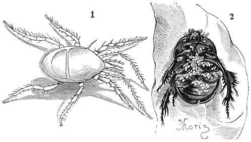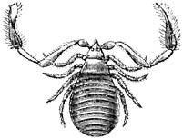 De Boekenschorpioen (Chelifer cancroides), die door zijne groote scharen op een Schorpioen zonder staart gelijkt, herinnert door de grootte, de kleur en den algemeenen omtrek van het sterk afgeplatte lichaam aan een Bedwants. Hij houdt zich op in oude huizen, tusschen stoffige boeken, in portefeuilles van herbariën en in kasten met insectenverzamelingen. Hier maakt hij zich verdienstelijk door [583]Stofluizen, Motten, Mijten en andere kleine Gelede Dieren te verslinden. Bij ’t openen van een door hen bewoonde insectenkast ziet men deze diertjes kreeftachtige bewegingen maken, met even groot gemak achteruit en zijwaarts als vooruit loopen en met de lange kaaktasters naar links en rechts telegrafeeren; zij zijn geheel buiten staat om zich tegen de hen vattende vingers te verweeren. Het wijfje legt ongeveer 30 eieren en draagt deze aan de buikzijde van ’t achterlijf mede.
