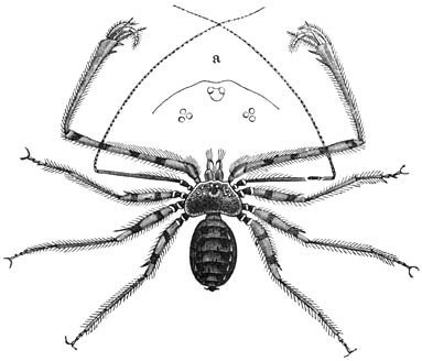 Langarmige Tarantelschorpioen (Phrynus lunatus). Ware grootte.—a) Voorste deel van het kopborststuk vergroot om de rangschikking der oogen te toonen.