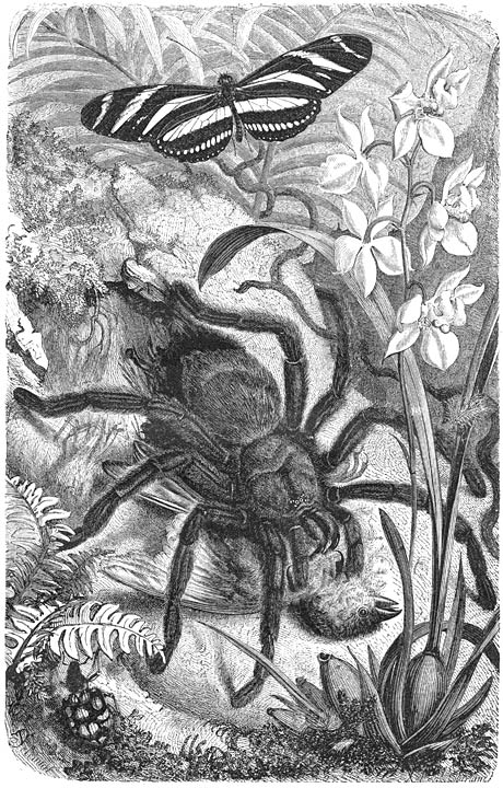 Tot het geslacht der Moord-, Bosch- of Vogelspinnen (Mygale), dat uitsluitend in de warme landen van beide halfronden aangetroffen wordt, behooren [588]Spinnen, die een lichaamslengte van 5 of meer cM. kunnen bereiken, doch met hare dikke, ruig behaarde pooten 18 cM. kunnen overspannen. Sommige reizigers hebben haar beticht van het dooden en verslinden van kleine Vogels; Bates heeft werkelijk een dergelijke Spin op heeterdaad betrapt. Of dit de Gewone Vogelspin (Mygale avicularia) was, dan wel een andere der veel op elkander gelijkende soorten van hetzelfde geslacht, is niet bekend. Over een diepen spleet van een dikken boomstam was een stevig, wit weefsel uitgespannen, in welks beschadigd onderste gedeelte twee vogeltjes (Vinken) hingen. Het eene was reeds gestorven, het andere lag onder het lichaam van de Spin, onmiddellijk onder de spleet, en was den dood nabij. Nadat Bates den roover verjaagd had, vond hij het vogeltje, dat weldra in zijne handen stierf, bedekt met eene smerige, op speeksel gelijkende vloeistof. Naar deze mededeeling en de gebrekkige houtgravure, die haar vergezelt, is de afbeelding vervaardigd; de Spin echter is geteekend naar een in spiritus geconserveerd exemplaar van de genoemde soort. Bates zegt uitdrukkelijk, dat het door hem waargenomen feit nieuw was voor de bewoners van Amazonië, die de bedoelde, in hun vaderland volstrekt niet zeldzame Spinnen Aranhas caranguexeiras (Kreeftspinnen) noemen. Dat het niet de gewoonte van alle Vogelspinnen kan zijn om zich met Vogels te voeden, blijkt uit hare verblijfplaatsen, die vermoedelijk niet dikwijls door de gevleugelde bewoners der lucht bezocht worden. Slechts weinige soorten leven op boomen en struiken, de meeste bewonen gaten in muren, daken van huizen, op welker muren men ze soms ziet zitten, ruimten onder steenen en holen in den grond. Dit laatste geldt o.a. van een dikke, bruine, in West-Indië en Brazilië levende, 65 mM. lange soort [Mygale (Therephosa) Blondii], die gemakkelijk herkend kan worden aan de gele strepen op de pooten. Zij bekleedt haar scheef afhellende, ongeveer 63 cM. lange gang met een zijden behangsel en gaat tegen den avond bij de opening op den loer liggen. Verschrikt vlucht zij diep in haar woning, zoodra zware voetstappen naderen. Ook in Zuid-Afrika schijnen de onder steenen wonende Moordspinnen veelvuldiger te zijn dan de op houtgewas levende. Met groote behendigheid trachten zij springend te ontkomen aan de vervolging van ieder, die haar wil vangen; altijd zijn zij gereed om met hare scherpe gifklauwen de grijpende vingers te kwetsen.