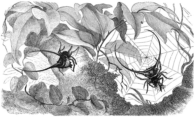 In de warme landen van beide halfronden, in Amerika tot in den staat Ohio, leven talrijke, tot verschillende geslachten behoorende soorten van Wielspinners, die zich kenmerken door een hoornachtig, van achteren in twee lange, rechte of kromme doornen eindigend rugschild op het achterlijf. Tot de meest verbreide behoort het geslacht der Doornspinnen (Gasteracantha), dat nog wel zonderlinger vormen omvat dan de hierna afgebeelde Tangvormige Doornspin (Gasteracantha arcuata), die op Java gevonden wordt.