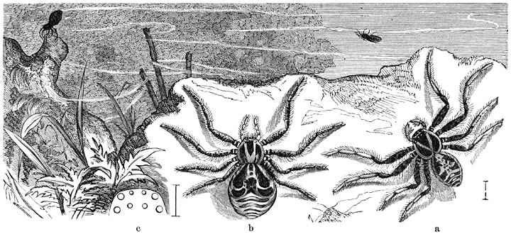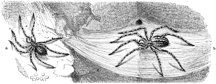 Vele Wolfspinnen bewonen gaten in den grond, welker wanden zij met haar spinsel bekleeden. Sommige voeren haar eierenzakje aan den buik mede of zitten er op, als om te broeden; door andere wordt het aan dennenaalden of aan lagere planten bevestigd, zoodat het aan een sierlijk vrachtje herinnert (fig 1); nog andere handelen op soortgelijke wijze, hoewel haar nestje een minder regelmatigen vorm en door de zand- en leemkorrels, die er aan kleven, niet zulk een schitterend witte kleur vertoont.