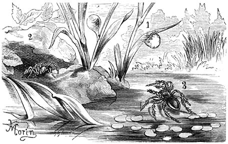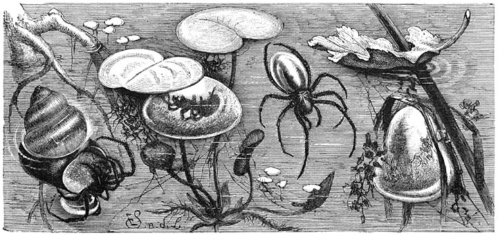 Wanneer deze kleine duikkunstenares een nest wil [594]bouwen, begeeft zij zich naar den waterspiegel en steekt, op den kop staande, met naar boven gerichten buik, de spits van haar achterlijf boven de oppervlakte in de lucht, spreidt de spintepels uit en daalt schielijk weer in ’t water af. Zoodoende neemt zij, zonder dat het zilveren omhulsel van het achterlijf er bij te pas komt, een meer of minder groote, aan de spits van ’t lichaam hangende luchtbel mede. Deze wordt zwemmend vervoerd naar de waterplant, die bij een vroeger bezoek geschikt werd geoordeeld voor ’t bouwen van een woning en hier vastgehecht. Dit vereischt natuurlijk het gebruik van spinstof, die, uit de spintepels ontwijkend, als een soort van vernis, dat met de achterpooten wordt uitgestreken, de lucht van het water scheidt, daar deze anders onmiddellijk weer naar boven zou stijgen. Opnieuw gaat zij een luchtbel halen, die na doelmatige vergrooting van het reeds aanwezige spinsel met de eerste samenvloeit; deze arbeid wordt voortgezet, totdat de kleine, met de opening naar beneden gerichte duikerklok ongeveer de grootte van een walnoot bereikt heeft. Verscheidene draden moeten natuurlijk gedurende het bouwen gespannen worden om aan het nest de vereischte stevigheid te verschaffen. Andere, die rondom den ingang zich in alle richtingen uitspreiden, dienen als valstrikken voor den zwemmenden buit. Indien de Spin hare slachtoffers afwachtte, zou zij menigmaal honger moeten lijden; zij gaat ze echter ook wel opzoeken en houdt zich niet strikt aan één bepaalde wijze van jagen gelijk hare verwanten, die in de lucht vangwebben hebben. Zoodra zij een prooi gegrepen heeft, kruipt zij bij den eersten den besten stengel omhoog en verslindt het lekkere hapje in de lucht; soms kiest zij tot eetzaal haar duikerklok, of hangt hierin het overschot voor toekomstig gebruik op, zoodra haar honger gestild is. In de gevangenschap bevestigt de Waterspin haar duikerklok ook wel aan den wand van het glas, waarin zij leeft.