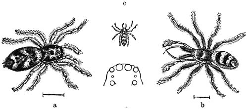 Huisspin (Tegenaria domestica):—a) Mannetje (hieronder, op vergroote schaal, de oogen van voren gezien). b) Wijfje.—Ware grootte.