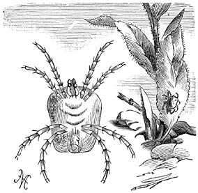 De orde, die de Mijten en Teken omvat, is, na de Echte Spinnen, de belangrijkste van de geheele klasse. Mijt en Teek zijn algemeen bekende namen, die echter slechts bij enkele menschen een duidelijke voorstelling wekken van eenige der hierdoor aangeduide dieren. Uit de nog steeds zeer onvolledige uitkomsten van de onderzoekingen, die de Acarinen betreffen, blijkt, dat zij door vorm en levenswijze zeer uiteenloopen. Slechts weinige Acarinen kan men met het bloote oog onderscheiden; de meeste zijn microscopisch klein en worden in ’t geheel niet opgemerkt, tenzij men er opzettelijk naar zoekt, of vertoonen zich, zoo zij in onnoemelijke menigte bijeenleven, als bewegelijke stofjes, als een meer of minder duidelijk gewriemel aan of in producten van plantaardigen of dierlijken oorsprong, die bewaard worden om als voedsel voor mensch en vee of als grondstof voor sommige industriën te dienen. Men denke slechts aan mijterige kaas, en houde in ’t oog, dat het witte korstje op gedroogde pruimen en dergelijke vruchten niet altijd uit suiker, maar dikwijls uit millioenen van nietig kleinen Mijten bestaat. Wegens de schade, die deze Acarinen aanrichten, verdienen zij onze aandacht; nog hoogere aanspraken hierop hebben vele soorten, die, als parasieten op menschen en dieren levend, tot pijnlijke en walgelijke ziekten aanleiding geven.