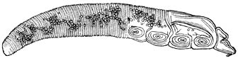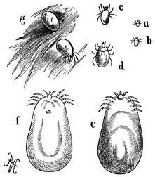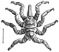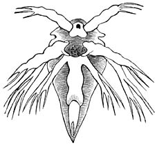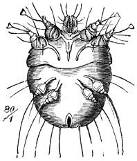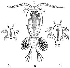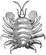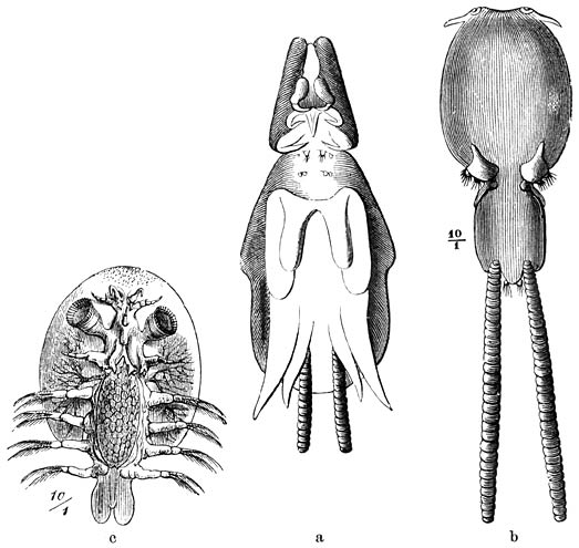 b) Lernanthropus. (Wijfje, buikzijde.) De omtreklijn herinnert aan die van een mensch, vandaar de naam. Het kopborststuk is klein en met 8 paar hechtorganen uitgerust. De beide voorste paren achterlijfspooten zijn nagenoeg verdwenen; de beide achterste paren zijn zeer groot en plaatvormig. Dit geslacht behoort tot de familie der Dichelestiden, van welker 50 soorten sommige op zoetwater-, andere op zeevisschen parasiteeren.