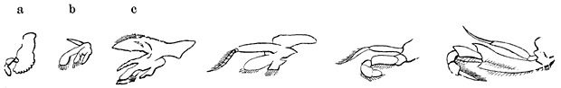 c) Artemia salina: Mannetje (het wortellid van de achterste sprieten zonder aanhangsel).—Vergroot.