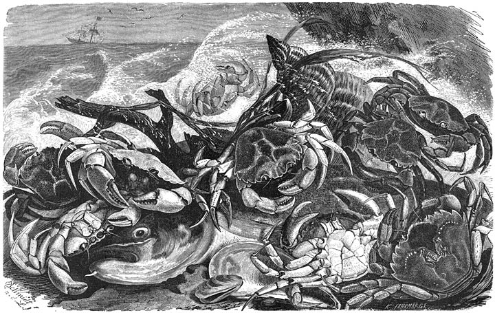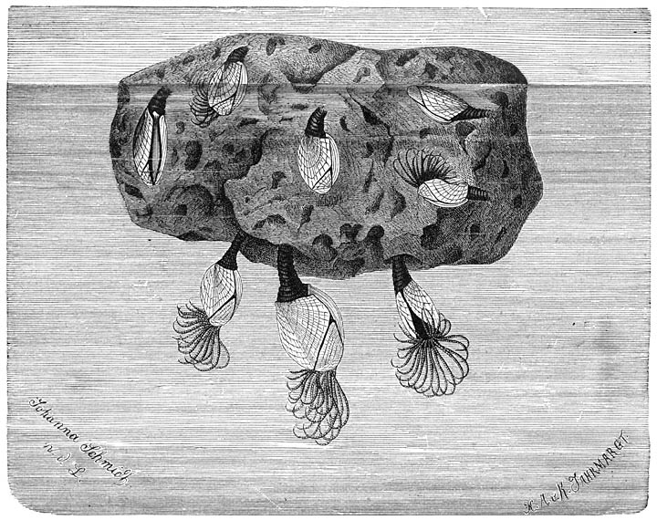 Sommige groote Cetaceën worden door bepaalde soorten van Zeepokken, minder dikwijls door Eendenmossels, bij voorkeur tot verblijfplaats gekozen. Daar Diadema balaenaris op den Keporkak of Groenlandschen Bultrug geregeld voorkomt en zelfs zeer jonge dieren bewoont, beweren de Groenlanders, dat de jongen er reeds in ’t lichaam [627]van de moeder mede bezet zijn. Twee andere soorten—Coronula balaenaris en Tubicinella trachealis—schijnen uitsluitend den Gladden Walvisch van het Zuidelijk halfrond (Leiobolaena australis) te bewonen. Daarentegen vestigen zich nooit Cirripediën op de huid van den Gladden Walvisch van het hooge noorden (of Groenlandschen Walvisch); evenmin worden op Vinvisschen Balaniden gevonden.