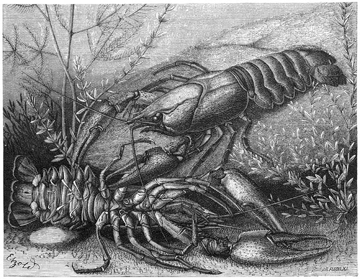 De Eucopepoden, die op andere dieren leven en hieraan haar voedsel ontleenen, worden gewoonlijk samengevat onder den naam van Vischluizen. Zij kenmerken zich door het bezit van een zuigbuis, die de stiletvormige, in steekorganen veranderde kaken omgeeft, en door de vervorming van één paar sprieten en één of meer paren kaakpooten in hechtorganen. Meer of minder innig zijn zij verbonden met de Visschen, die van alle waterdieren het meest door haar begunstigd worden. Het eene uiterste is, dat de Vischluis het door haar bezochte dier naar verkiezing kan verlaten, het andere, dat de gast met zijne hechtorganen of met het voorste deel van zijn stam zoo ver in den gastheer [629]doordringt, dat er een mes noodig is om den parasiet in onbeschadigden toestand los te maken. De laatstgenoemde wijze van vasthechting gaat altijd, althans bij de wijfjes, gepaard met teruggaande gedaantewisseling, waarbij alle voor een zelfstandig leven vereischte organen verloren gaan en van de oorspronkelijke geleding geen of slechts onbeduidende sporen overblijven. Zoo verkrijgen de Kieuwwormen (Lernaeidae, Lernaeopodidae)—b.v. de 4 cM. lange Schelvisch-kieuwworm (Lernaea branchialis), en in nog meerdere mate het 1 cM. lange, op dezelfde Visschen levende Ankertje (Anchorella uncinata)—hun zonderlinge gedaante, verfraaid of ontsierd door allerlei knobbels en getakte of gelobde uitwassen. De meestal niet misvormde mannetjes zijn dwergachtig in verhouding tot hunne wanstaltige levensgezellinnen, waaraan zij na den larvetoestand levenslang vastgeklemd blijven en met welker levensvocht zij zich voeden.