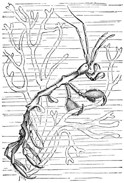 Een afzonderlijke onderorde vormen de zeer zonderling gebouwde Spookkreeftjes, die Keelpootigen (Laemadipoda) worden genoemd, omdat door vergroeiing van den kop niet slechts met den eersten maar ook met den tweeden borstring, het eerste paar ware pooten schijnbaar aan den kop is gehecht. Het achterlijf is bij hen zeer weinig of niet ontwikkeld en bezit geen of slechts rudimentaire ledematen. De talrijke, meestal niet meer dan 15 mM. lange Caprella’s, waarvan eenige ook aan onze kust gevonden zijn, leven op ondiepe plaatsen op zeeplanten. Hare werkzaamheden leveren een aardig schouwspel op. Zij zijn de beste acrobaten van hare klasse; behendig als Apen en met vele buitelingen en lichaamsverdraaiingen bewegen zij zich langs en tusschen de takken van de onderzeesche miniatuurwouden. Door haar voortdurende bedrijvigheid steken zij gunstig af bij de verwante Walvischluizen (Cyamus), welker eivormig, van boven naar onderen samengedrukt lichaam een klein, smal kopgedeelte heeft. Aan de huid van de Dolfijnen en andere Walvischachtigen, waarop zij parasieteeren, zijn zij met hare krachtige klauwen vastgehecht.