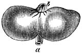 Krabbezakje (Sacculina carcini). b. Mantelopening. a. Afvoeropening.