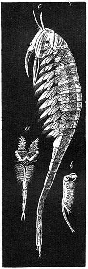 Eénoog (Cyclops): a) Wijfje (rugzijde: van de ledematen zijn alleen de beide paren sprieten zichtbaar). 8-voudige vergrooting.—De naam Cyclops, die vroeger aan alle Zoetwater-Copepoden gegeven werd, dient thans tot aanduiding van een meer dan 50 soorten omvattend geslacht, waarvan slechts een enkele ook in de zee aangetroffen wordt. Alle hebben slechts één oog op het voorhoofd en ontleenen hieraan hun naam. Dit kenmerk hebben zij echter gemeen met alle overige Cyclopiden en zelfs met de meeste Eucopepoden. (De Corycaeïden hebben, behalve het voorhoofdsoog, in den regel 2 zijoogen.)—Aan het voorste deel van het na-achterlijf hangen de beide eierenzakjes. Cyclops vulgaris, die overal veelvuldig in stilstaand water (zelfs in regenbakken en goten) aangetroffen wordt, vult ieder eierenzakje (dat ongeveer 30 eieren bevat) in de zomermaanden om de 14 dagen opnieuw.—b, b) Larven van verschillenden leeftijd, bij 150-voudige vergrooting.