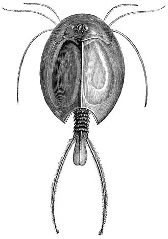 De Watervlooien (Cladocera) staan als tweede onderorde naast de Bladpootigen. Des morgens vroeg, maar ook op warme, stille avonden en bovendien bij bewolkte lucht zwemmen deze diertjes, waarvan de grootste zelden langer zijn dan 6 mM., dicht bij den waterspiegel; zij begeven zich echter naar de diepte, zoodra de zon met eenige kracht op het water begint te schijnen. Sommige soorten houden zich trouwens altijd liever dicht bij den slijkerigen bodem dan in hoogere waterlagen op. Dat zij reeds voor lang de aandacht der natuuronderzoekers trokken, is niet te verwonderen, daar zij gewoonlijk in groote menigte stilstaand en langzaam stroomend water bevolken. De Cladoceren en Copepoden maken, volgens Leijdig, nagenoeg het eenige voedsel uit van de meest geschatte Visschen der Beiersche bergmeren en van de Bodensee, van de Roode Forellen (Salmo salvellinus) en Blauwe Houtingen (Coregonus Wartmanni), welker vangst een middel van bestaan is voor een groot aantal bewoners van de meerdistricten.