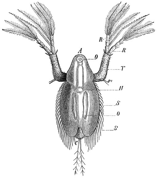 Swammerdam (1637–1680) heeft het eerst deze soort nauwkeurig onderzocht en haar in zijn „Bijbel der Natuur” beschreven en afgebeeld. Bij alle Echte Watervlooien steekt boven de tweekleppige schaal, die den romp omgeeft, een bollen, gesnavelden, door een afzonderlijken helm bedekten kop (A) uit. De binnenste sprieten, die fijne, zenuwrijke tastdraden dragen, zijn onder het uiteinde van den snavel gelegen. Onmiddellijk boven hun oorsprong bevindt zich het groote oog (O), dat door een aantal spieren gedraaid kan worden. De buitenste sprieten (T) zijn tot groote, getakte roeiorganen vervormd, door welker slagen het dier zich springend, als een Vloo, voortbeweegt. Zeer verborgen onder den kophelm en de voorste bocht van de schaalhelften liggen de monddeelen. De tweekleppige schaal (S) is een huidplooi van de lichaamsafdeeling, die de borst der Insecten vervangt. Er bestaat een zekere overeenkomst tusschen deze kleppen en de vleugels der Insecten, waarmede men ook, waarschijnlijk met evenveel recht, de zijstukken van het pantser der Tienpootigen vergeleken heeft. Slechts bij enkele doorzichtige Insecten-larven kan men aan het levende dier zoo nauwkeurig als bij de Watervlooien de werking van het hart (H) waarnemen. Het heeft meestal den vorm van een rondachtige blaas. Als ademhalingsorganen dienen de bladvormige aanhangsels van de 5 (zelden 6) paren pooten. Het na-achterlijf van deze Schaaldieren ligt vrij onder de schaal, eindigt in klauwen of in twee staartborstels (C) en is een krachtig roeiorgaan.—De mannetjes onderscheiden zich van de wijfjes door geringere grootte, bij de meeste soorten bovendien door den vorm der binnenste sprieten, bij sommige ook door een zeer fraaie, blauwe of roode kleur. Gewoonlijk verschijnen zij eerst in den herfst. In de lente en in den zomer treft men geen andere dan vrouwelijke individuën aan, die zich parthenogetisch voortplanten. Hare zoogenaamde „zomereieren” hebben een lichtgekleurde, dunne schaal en ontwikkelen zich zeer snel; verscheidene dergelijke generatiën volgen elkander op. De bevruchte eieren overwinteren [632]en worden daarom „wintereieren” genoemd; zij zijn grooter, donkerder van kleur, harder van schaal en bovendien bij de meeste soorten besloten in een omhulsel, dat „zadel” (ephippium) heet. Dit ontstaat door het geheel of gedeeltelijk losgeraken van de schaal der moeder; zelden bevat het slechts 1 ei, gewoonlijk 2, in enkele gevallen verscheidene eieren, die op deze wijze tegen uitdroging en vorst beschut zijn.