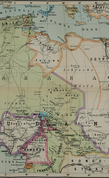 Wenn ich mich an diese Aufgabe gewagt habe, so ist es deshalb geschehen, weil ich seit längerer Zeit Gelegenheit hatte, die Vorgänge im Innern Afrikas zu verfolgen. Im Jahre 1894 wurde ich mit der Führung einer Expedition nach dem Tschadsee, deren Ausgangspunkt Tripolis sein sollte, betraut, als die Nachricht von der Eroberung der in Betracht kommenden Gebiete durch Rabeh und von der darauf erfolgten Sperrung der Karawanenstrassen zwischen dem Tschadsee und Tripolis in Europa eintraf. Infolge dessen wurde meine bereits in Vorbereitung begriffene Expedition zunächst verschoben und darauf gänzlich aufgegeben, zumal inzwischen ein Vertrag zur Regelung der Ostgrenze unserer[S. viii] Kamerun-Kolonie mit Frankreich abgeschlossen worden war.