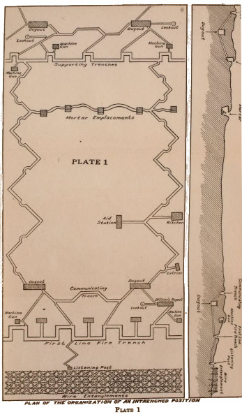 3. Then comes the first line fire trench with attached machine-gun emplacements at convenient points. (See Fire Trench and Machine-Gun Emplacements, pp. 24 and 44.)