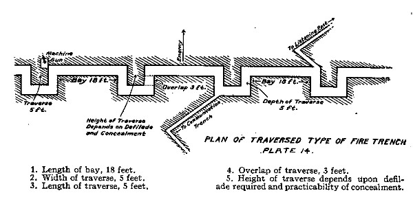 5. At a variable distance in rear of the fire trench (100 to 200 yards) the emplacements for[Pg 2] bomb-throwing apparatus and trench mortars are located. These are connected up laterally by a communication trench which joins with the main communication trench running from front to rear through the position. (See Emplacements for Trench Mortars, p. 41.)