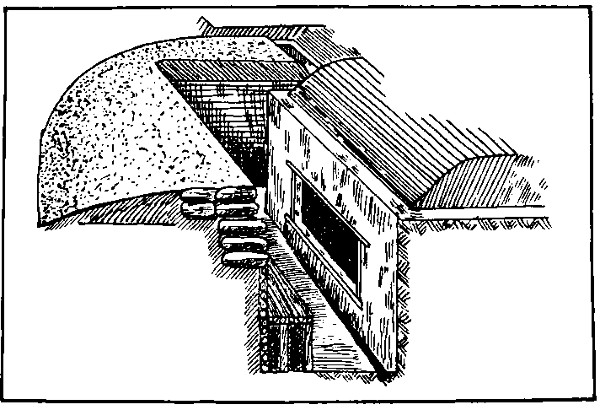 6. From 100 to 400 yards to the rear of the first line fire trench, and generally parallel to it, is the supporting trench or cover for the supports. This trench is invariably provided with strong overhead cover and a system of dugouts for the protection of the troops. (See Cover for Supports, p. 48.)