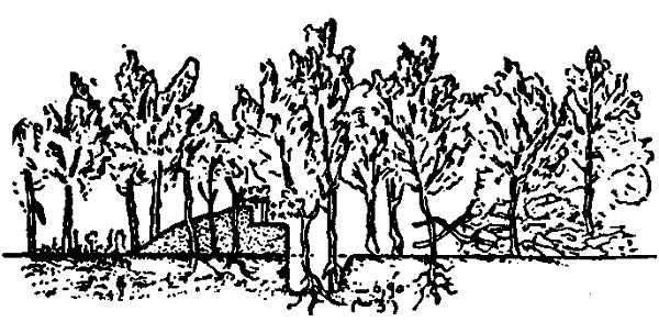 Abatis (pronounced abatee) consists of branches of trees lying parallel to each other, butts pointing to the rear, and the branches interlaced with barbed wire. All leaves and small twigs should be removed and the stiff ends of branches[Pg 6] pointed. The butts are staked or tied down of, anchored by covering them with earth. When more than one row is used the branches overlap the butts of those in front so as to make the abatis about 5 feet high. An abatis formed by felling trees towards the enemy, leaving the butt hanging to the stump, is called slashing.