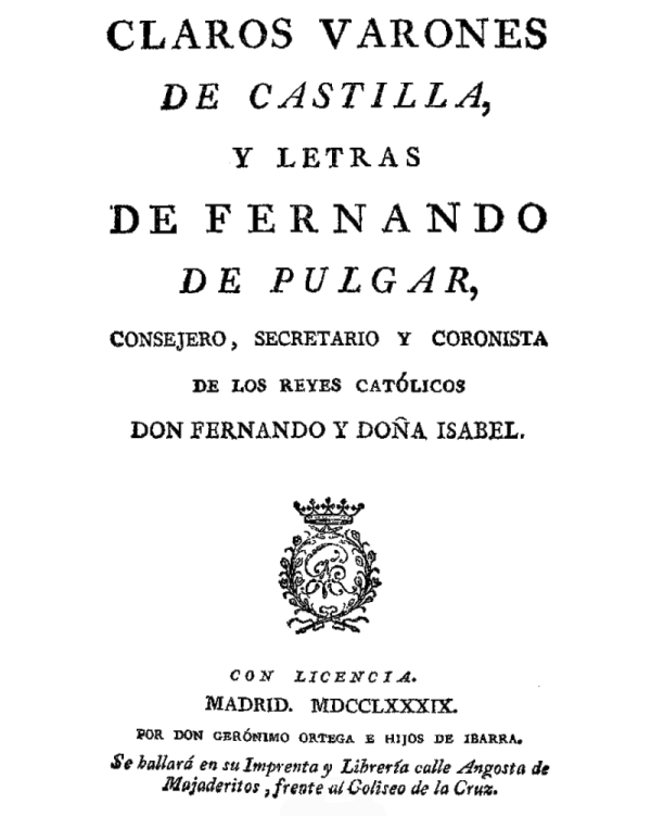 Entre todas las ediciones que se han hecho hasta ahora de los Claros Varones y Letras de Pulgar la mas completa es la impresa en Madrid en quarto el año de 1775 por el esmero y cuidado que puso el sabio Editor, á quien somos tambien deudores de la Vida del Autor, y de las Adicciones á los Claros Varones. Por lo mismo la hemos preferido á las anteriores para original de ésta, y esperamos sea tan bien recibida como aquella, de la qual apenas se puede haber un exemplar á las manos. En quanto al tamaño, hemos elegido el presente, atendiendo á la mayor comodidad de los Lectores.
