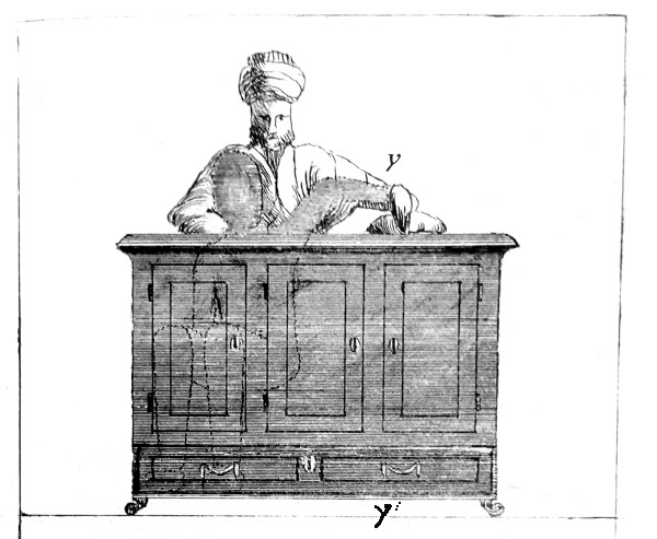 The player may be introduced into the chest through the sliding panel (u, fig. 6), at the end. He will then elevate the false back of the large cupboard, and assume the position represented by the dotted lines in figs. 3 and 4. Every thing being thus prepared, “the charm’s wound up,” and the exhibiter may begin his operations by [Pg 25] opening the door (a). From the crowded and very ingenious disposition of the machinery in this cupboard, the eye is unable to penetrate far beyond the opening, and the spectator is led to conclude that the whole space is occupied with a similar apparatus. This illusion is strengthened and confirmed by observing the glimmering light which plays among the intricacies of the machinery, and occasionally meets the eye, when the lighted candle is held at the door (b). A fact, too, is ascertained, which is equally satisfactory, though indeed for opposite reasons, to the spectator and the exhibiter, viz. that no opake body of any magnitude is interposed between the light and the spectator’s eye. The door (b) must now be locked, and the screen (i) closed, which being done at the moment the light is withdrawn, will wholly escape observation.