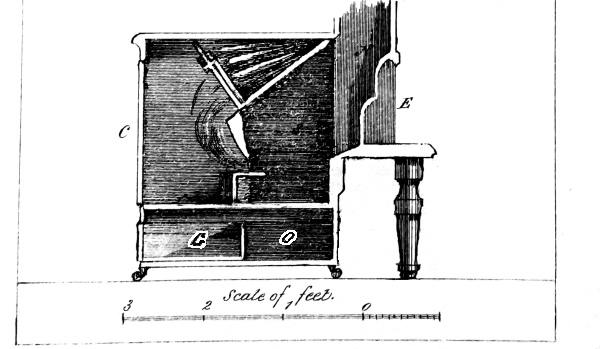 When the drapery has been lifted up, and the doors in the trunk and [Pg 29] thigh opened, the chest may be returned to its former situation, and the doors be closed. In the mean-time the player should withdraw his legs from behind the drawer, as he will not so easily effect this movement after the drawer has been pushed in.