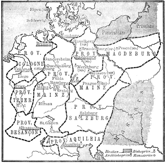 Even King Henry had found it necessary, before the end of his reign, to rely upon ecclesiastical support, especially in his efforts to civilise the marks. There the fortified churches and monasteries became, like the new walled towns, centres of defence, besides being the only homes of civilisation and culture in those wild regions. But King Henry had not removed the danger of Wendish invasion, and the civil wars of Otto’s early years gave a new opportunity for the heathen to ravage the German frontiers. In the midst of Otto’s worst distress, Hermann Billung kept the Wends at bay, and taught the Abotrites and Wagrians, of the lands between the lower Elbe and the Baltic, to feel the might of the German arms. His efforts were ably seconded by the doughty margrave, Gero, of the southern Wendish mark. By their strenuous exertions the Slavs were for the time driven away from German territory, and German rule was extended as far as the Oder, so that a whole ring 22of organised marchlands protected the northern and eastern frontiers. These marks became vigorous military states, possessing more energy and martial prowess than the purely Teutonic lands west of the Elbe, and destined on that account to play a part of extreme prominence in the future history of Germany. Owing their existence to the goodwill and protection of the king, and having at their command a large force of experienced warriors, the new margraves or counts of the marches, who ruled these regions, gradually became almost as powerful as the old dukes, and, for the time at least, their influence was thrown on the side of the king and kingdom. Under their guidance, the Slav peasantry were gradually Christianised, Germanised, and civilised, though it took many centuries to complete the process. Even to this day the place-names in marks like Brandenburg and Meissen show their Slavonic origin, and a Wendish-speaking district still remains in the midst of the wholly Germanised mark of Lausitz. To these regions Otto applied King Henry’s former methods on a larger scale. Walled towns became centres of trade, and refuges in times of invasion. Monasteries arose, such as Quedlinburg, and that of St. Maurice, Otto’s favourite saint, at Magdeburg. A whole series of new bishoprics—Brandenburg and Havelberg, in the Wendish mark; Aarhus, Ripen, and Schleswig, in the Danish mark—became the starting-points of the great missionary enterprise that in time won over the whole frontier districts to Christianity. Hamburg became the centre of the first missions to Scandinavia. Never since the days of Charles the Great had the north seen so great an extension of religion and culture. There was many a reaction towards heathenism and barbarism before the twelfth century finally witnessed the completion of this side of Otto’s work.