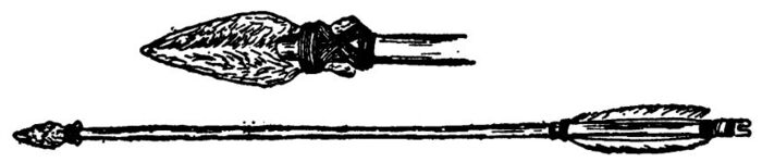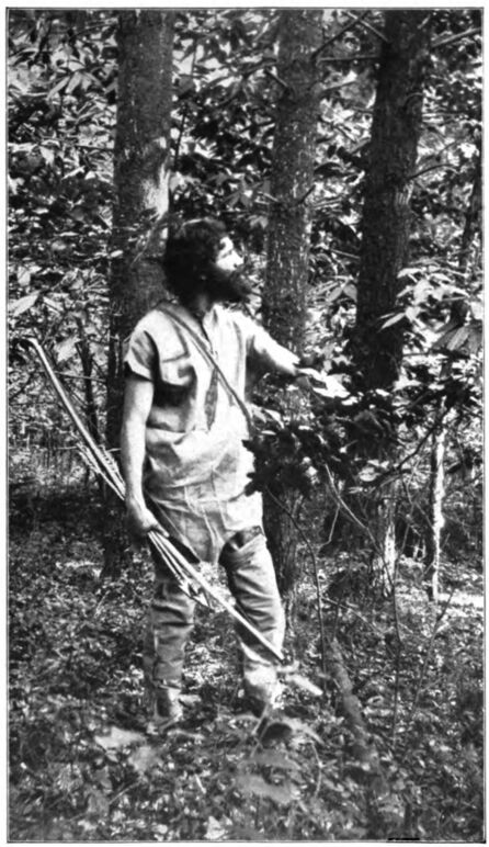 It was an ill-smelling mess, and without more ado I cast it into the river and dined on mussels and fungus, for I was too tired to attempt a trip to my frog-pond or the brook. The next morning, however, I visited the brook and my deadfall, but the latter was empty, although sprung, and I failed to secure a single trout. The reason was simple. The brook had been so swollen by the recent rains that it was impossible to dam up any of the pools, while the pond was filled to overflowing and only one small frog could be found by dint of the most careful search. Despite my ill luck, however, I returned to camp quite elated, for while making my way about the little pond in search of frogs I had discovered some thick bushes with reddish stems so straight, smooth, and polished that they at once struck me as being perfectly adapted for arrows. Not until long afterward did I learn that this bush was known as “arrow wood” and that the Indians formerly used it for their arrows.