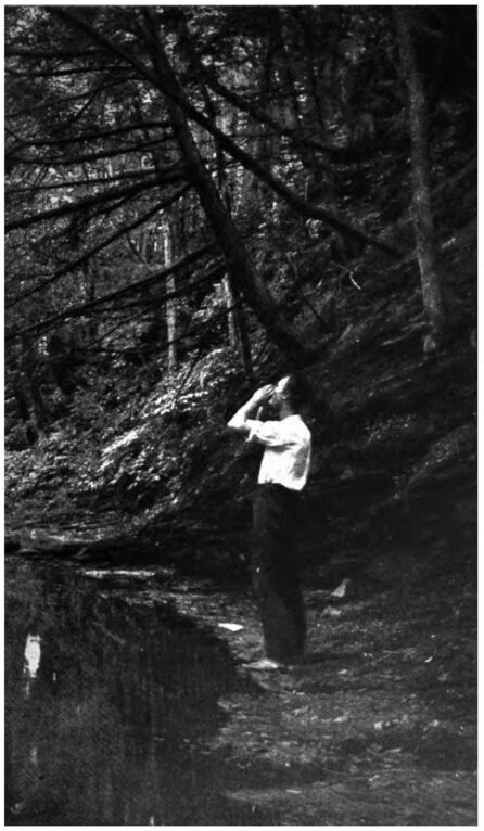 Nearly every tree was well covered with lichens and moss and I could not see that these growths were any thicker on one side than the other. I was about to abandon this scheme for determining direction when I made a discovery. Glancing up and down the trunks in search of the moss growths, I noticed that one side of every tree was dark-colored and damp, whereas the other side was grayish and drier, and the damp side I soon found corresponded to the north as determined by my glimpse of the sun above the river. I was quite elated by this and I now noticed that the mosses did appear heavier and more luxuriant on the damp side of the trees than on the dry side. A further scrutiny and comparison of the various trees also convinced me that the branches, twigs, and leaves were thicker and more regular on the south side of the trees than on the north, and that more dried and dead branches and stubs projected from the north side of the trees than from the south side. Fixing these facts in my mind, I determined to test my discoveries by actual experiment, and without looking at the tree trunks I wandered aimlessly ahead for several hundred yards. Then, closing my eyes, I walked slowly about for some time, bumping into numerous trees and tripping over fallen branches several times—until I felt that I had lost all sense of direction. Then, opening my eyes, I looked about. I was out of sight or sound of the river, the only signs of sunshine were faint, bright patches amid the lofty foliage of the trees, and nothing was in view which seemed familiar. For a moment my heart thumped and I shuddered to think what might happen if my signs failed and I could not find my way back to the river. It was a dangerous experiment, the peril of which I did not fully realize even then, but, pulling myself together, I focused my attention on the trees about me. There was no question about it, scarcely a glance was needed to show me which side of the trees faced the north and which the south, and, knowing that the river flowed to the east of the woods wherein I stood, I turned and started to retrace my steps. Even as I did so I realized how important was my newly acquired knowledge of this feature of woodcraft, for the direction which I had felt sure would lead me toward the river was exactly opposite to that which was shown to be right by the trees.