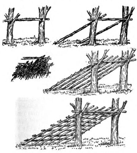 However, if I was to have a shelter at all it behooved me to begin at once, and I started forth to select a site for my home. I found a sheltered, dry knoll with good drainage a short distance from the river and with plenty of building material in the form of balsam firs, pines, and birches near at hand. I first selected two young trees, about five feet apart, and from these I cut the lower branches, leaving the stubs projecting a few inches. Across two of these I placed a light spruce pole and from the ends of this I laid other poles extending back at an angle to the ground.