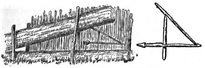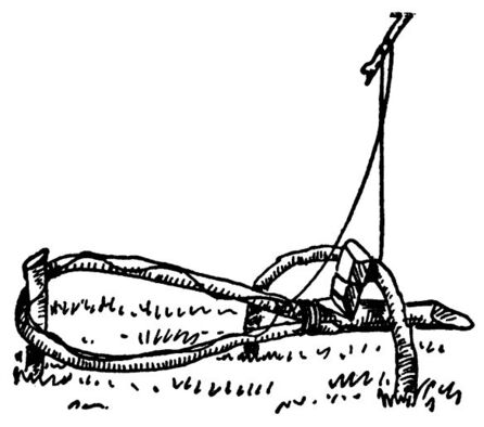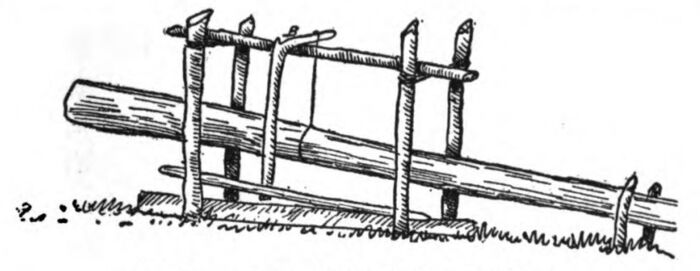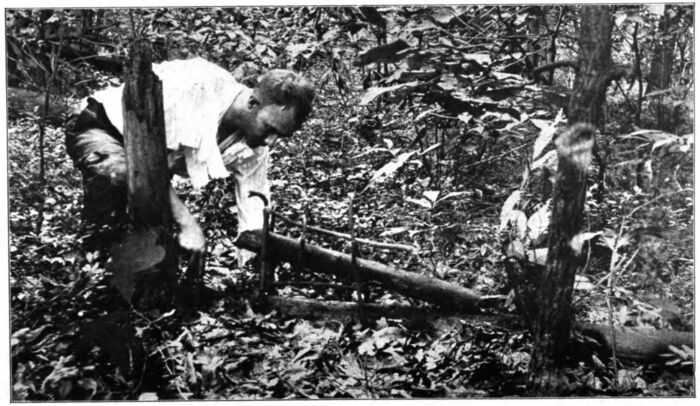 I did not know what sort of food the muskrat ate and I therefore decided to arrange a trap which would be sprung by the rat passing along the trail. First I placed a smooth stick of wood across the run, and on either side among the grass I drove two stakes with a space of a few inches between them. In this space I slipped a fairly heavy log which I found beside the pond, and I then lashed the tops of the stakes together so the log could slide readily up and down between the stakes which served as guides, and across the lashing of roots I laid a light stick. For a trigger I selected an “L”-shaped twig, and from one end of this I tied a strong root, with the other end of the fastening looped about the heavy log. This was adjusted until, when the trigger was placed across the light stick between the uprights, the heavy log was raised a few inches above the log set in the pathway. Next a very light stick was placed just above the lower log and the end of the trigger was placed resting against this, so that the pressure of the drop-log forced the trigger against the stakes. It was a very simple arrangement, but I knew that if any creature attempted to pass over the log upon the ground he would of necessity move the trigger-stick and allow the log to drop upon his back. The trap being set, I spent some time in securing a supply of frogs about the pond, and then started toward camp. I soon reached the brook and turned aside for the trout in their birch-bark receptacle, thinking with pleasurable anticipation of the fine meal in store for me.