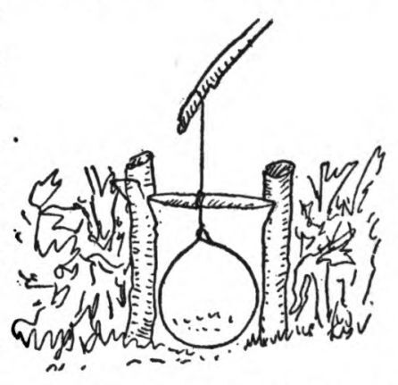 Cutting a number of short sticks, I pushed them into the earth about the fungus, thus inclosing it on all sides but one. On either side of the opening thus left I drove two stout stakes with notches near their upper ends. From a bit of dead wood I then whittled out a spindle-shaped piece just long enough to reach from one of these stakes to the other. Then with a fine hemlock root I formed a noose, tied the spindle to the fiber just above it, and fastened the end of the root to the tip of a small sapling close by. Bending down the latter, I slipped the spindle into the notches in the stake, spread the noose across the opening, and my snare was completed. I was very proud of my work, simple as it was, and was quite confident that when the hare returned to finish his meal he would push his head through the noose, dislodge the spindle, and would be jerked into the air and killed by the spring of the sapling. I stood for a moment looking at the snare and the fungus and suddenly roared with laughter at my own stupidity. Here I had been working for nearly an hour to set a trap which might or might not catch the rabbit, and within a few inches was a supply of food of far more value and to be had without the least effort. Surely if a rabbit could eat the fungus, so could I, and I plucked a bit of the queer growth and tasted it.