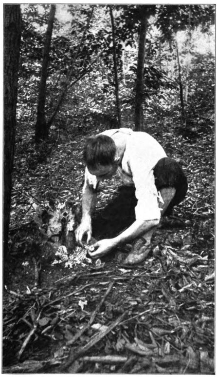 I realized that the tiny sparks which I could obtain in this way would never ignite a twig, or even a bit of bark, and that some inflammable tinder, which would catch the spark and which could then be fanned to a flame, must be secured before I could hope to succeed. As I was thinking of this my gaze fell upon a black-edged hole in my handkerchief. It had been burned, a couple of days before, by a spark from Joe’s pipe blown back by the wind. The incident was too trivial to have filled my thoughts for an instant at another time, but now all its details came back to me with a rush and I gave a shout of joy as I suddenly realized that this burnt hole and the events which had caused it had actually solved my puzzle. Seizing the square of cotton cloth, which was now quite dry, I weighted it down with bits of stone—for the apparently useless handkerchief had now become of the utmost value to me—and hurried into the woods in search of dry twigs and other inflammable material. I had not long to hunt, for dead and dried trees were all about; several white birches furnished sheets of paper-like bark, and with a great armful of fire-wood I returned to my rock. Gathering the handkerchief into a loosely crumpled mass, I placed it on the rock, held the most promising of my pebbles close to it, and struck the stone sharply with the back of my knife-blade. A little shower of sparks flew forth at the blow, but none fell upon the handkerchief. Again and again I tried, each time holding the stone in a different position and trying my best to cause the sparks to fall upon the handkerchief. Finally I gathered the cloth in my hand, held the pebble in the midst of its folds, and struck it.