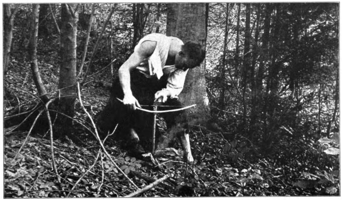The bow was an easy matter, for spruce was as good as anything, and this tree was abundant everywhere. While cutting the bow for fire-making I remembered my determination to attempt the manufacture of bow and arrows and I selected several likely-looking spruce boughs for this purpose. I next looked about for a suitable stick for the drill and selected some straight, old, dry fir roots from a tree which had been torn up and blown over by some winter’s storm years before. A piece of the dry, weathered wood from the same tree served as material from which to make a fire-block, and from beneath the bark of a dead pine I secured a good supply of “punk.” A hard pine knot was selected for a drill-socket, but despite every endeavor I could find nothing which I was sure would serve as tinder. Shredded cedar bark I knew was as good as anything, but not a cedar could I find, and finally I decided to try the thin, papery, dried birch bark which flaked in little curling rolls from the trees. Armed with these various things, I returned to my lean-to and was soon busily preparing the materials for use. The flexible, springy spruce limb was whittled down to a rude bow, and not until then did I remember that all my youthful attempts at thus making fire had proved failures until I used a leather bowstring. For a moment I was nonplussed, for leather was out of the question, until I thought of my shoe-laces. One of these was sacrificed and replaced by hemlock roots, and I then whittled down a fir root into a double-pointed, octagonal spindle about fifteen inches long. With the tip of my knife-blade I dug out a recess in the pine knot and whittled the outside to fit easily in my hand and then turned my attention to the fire-block. A piece of the dry, seasoned fir was split into a little slab about three-fourths of an inch thick with notches cut along one edge, and I was ready for my experiment at fire-making.
